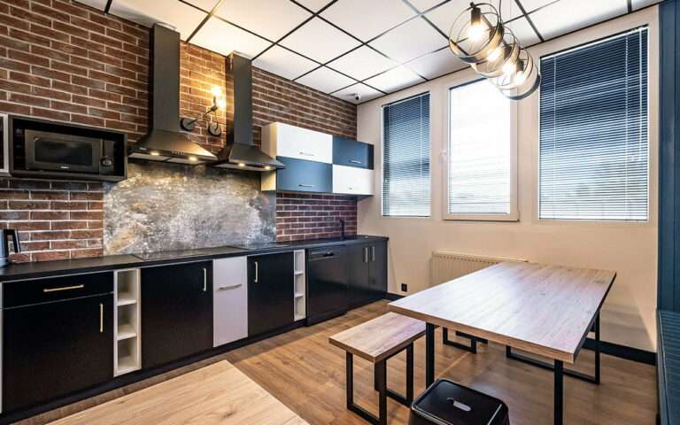 Kuchnia to pomieszczenie z pazurem. Postawiliśmy na dużą ilość szafek, 2 płyty grzewcze, dużą lodówkę, 2 mikrofalówki i zmywarkę. Przewodnie kolory to czarny i biały a największe siedzisko pomalowaliśmy na morski kolor, który łamie stereotypowe myślenie o elegancji. I…koniecznie zwróć uwagę na własnoręcznie stworzony blat!